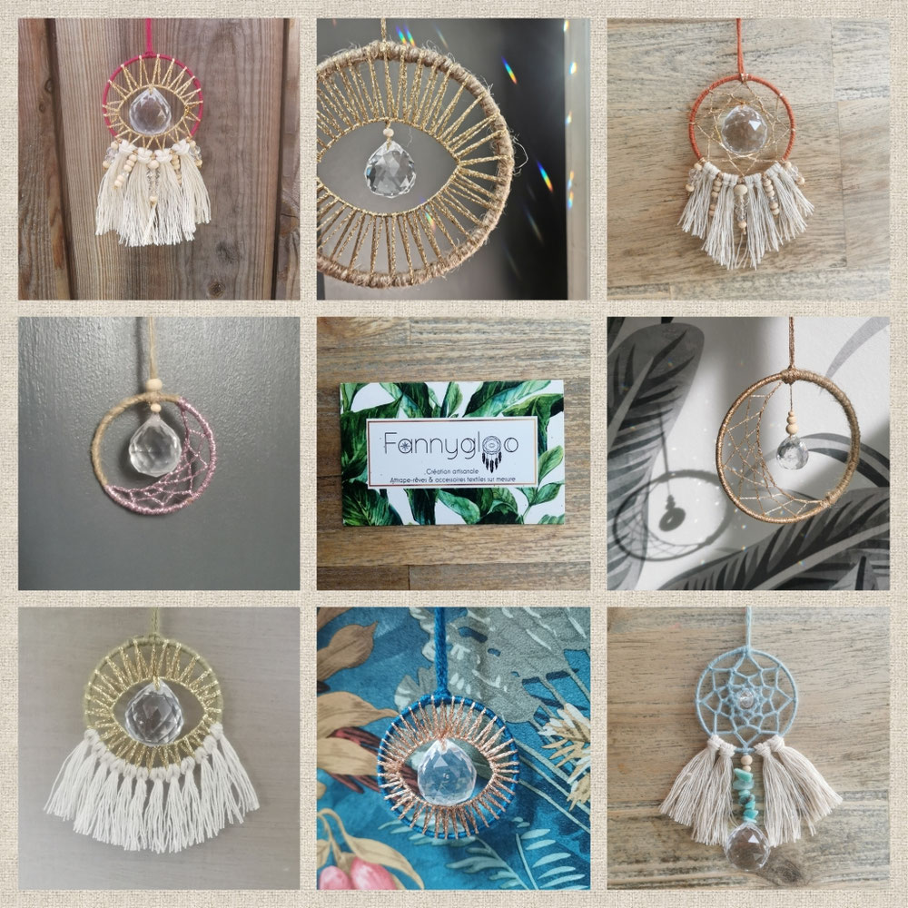Craquez pour la confection d'un attrape-rêves revisité et personnalisé by Fannygloo : des décorations murales éthiques et uniques, créées sur demande à votre image et selon vos souhaits, à s'offrir ou à offrir pour petits et grands (attrape-rêves réalisés en plusieurs tailles avec toutes sortes de matériaux, pour la plupart recyclés : laine, ficelle, plumes, anneaux en métal, plastique ou bois, perles, breloques, bois flotté, étoiles en papier origami, napperons chinés, chutes de tissus, etc). Pensez à vos cadeaux de naissance ou baptême.